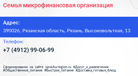 Семья, микрофинансовая организация по адресу 390026, Рязанская область, Рязань, Высоковольтная, 13 в дальнейшем Организация, размещена в следующих категориях:
