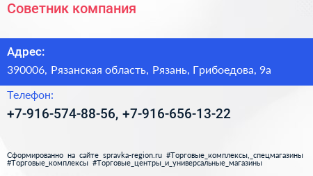 Советник, компания по адресу 390006, Рязанская область, Рязань, Грибоедова, 9а в дальнейшем Организация, размещена в следующих категориях: