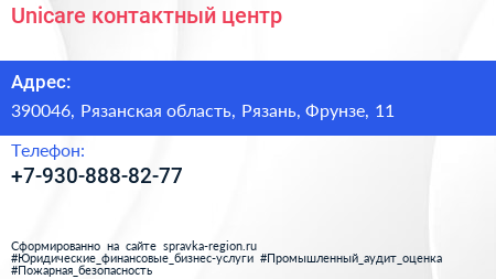 Unicare, контактный центр по адресу 390046, Рязанская область, Рязань, Фрунзе, 11 в дальнейшем Организация, размещена в следующих категориях: