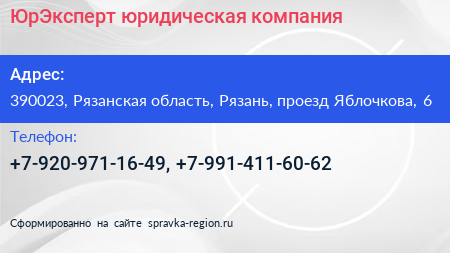 ЮрЭксперт, юридическая компания по адресу 390023, Рязанская область, Рязань, проезд Яблочкова, 6 в дальнейшем Организация, размещена в следующих категориях: