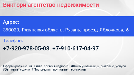 Виктори, агентство недвижимости по адресу 390023, Рязанская область, Рязань, проезд Яблочкова, 6 в дальнейшем Организация, размещена в следующих категориях: