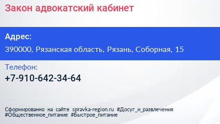 Закон, адвокатский кабинет по адресу 390000, Рязанская область, Рязань, Соборная, 15 в дальнейшем Организация, размещена в следующих категориях: