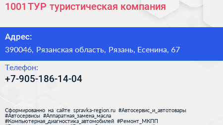 1001 ТУР, туристическая компания по адресу 390046, Рязанская область, Рязань, Есенина, 67 в дальнейшем Организация, размещена в следующих категориях: