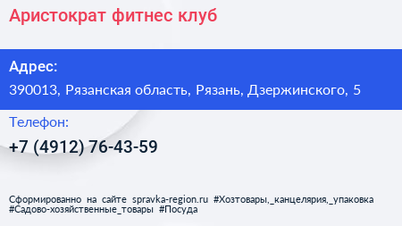 Аристократ, фитнес-клуб по адресу 390013, Рязанская область, Рязань, Дзержинского, 5 в дальнейшем Организация, размещена в следующих категориях:
