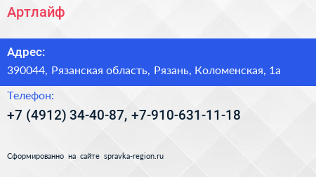 Артлайф по адресу 390044, Рязанская область, Рязань, Коломенская, 1а в дальнейшем Организация, размещена в следующих категориях: