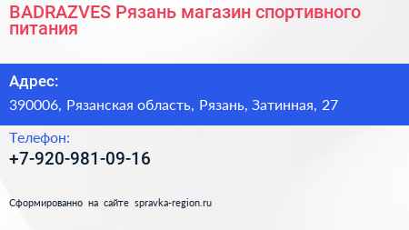 BADRAZVES-Рязань, магазин спортивного питания по адресу 390006, Рязанская область, Рязань, Затинная, 27 в дальнейшем Организация, размещена в следующих категориях: