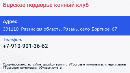 Барское подворье, конный клуб по адресу 391110, Рязанская область, Рязань, село Бортное, 67 в дальнейшем Организация, размещена в следующих категориях: