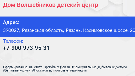 Дом Волшебников, детский центр по адресу 390027, Рязанская область, Рязань, Касимовское шоссе, 20 в дальнейшем Организация, размещена в следующих категориях: