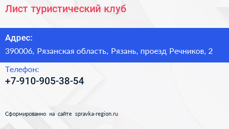 Лист, туристический клуб по адресу 390006, Рязанская область, Рязань, проезд Речников, 2 в дальнейшем Организация, размещена в следующих категориях: