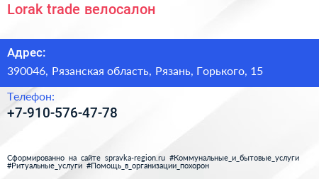 Lorak trade, велосалон по адресу 390046, Рязанская область, Рязань, Горького, 15 в дальнейшем Организация, размещена в следующих категориях:
