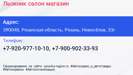 Лыжник, салон-магазин по адресу 390048, Рязанская область, Рязань, Новосёлов, 33г в дальнейшем Организация, размещена в следующих категориях: