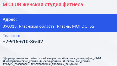M-CLUB, женская студия фитнеса по адресу 390013, Рязанская область, Рязань, МОГЭС, 5а в дальнейшем Организация, размещена в следующих категориях: