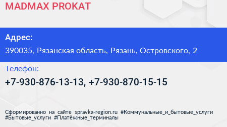 MADMAX PROKAT по адресу 390035, Рязанская область, Рязань, Островского, 2 в дальнейшем Организация, размещена в следующих категориях: