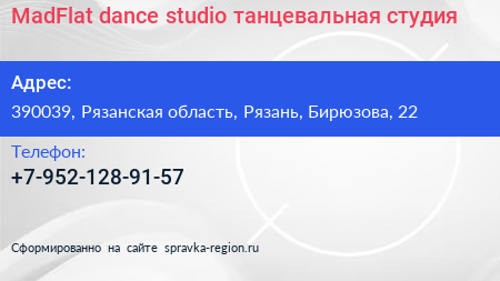 MadFlat dance studio, танцевальная студия по адресу 390039, Рязанская область, Рязань, Бирюзова, 22 в дальнейшем Организация, размещена в следующих категориях: