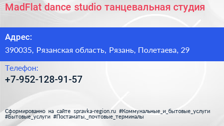 MadFlat dance studio, танцевальная студия по адресу 390035, Рязанская область, Рязань, Полетаева, 29 в дальнейшем Организация, размещена в следующих категориях: