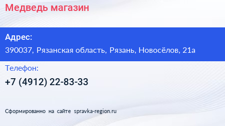 Медведь, магазин по адресу 390037, Рязанская область, Рязань, Новосёлов, 21а в дальнейшем Организация, размещена в следующих категориях: