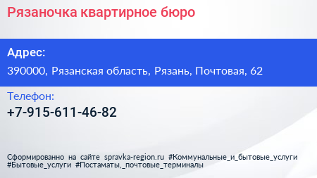 Рязаночка, квартирное бюро по адресу 390000, Рязанская область, Рязань, Почтовая, 62 в дальнейшем Организация, размещена в следующих категориях: