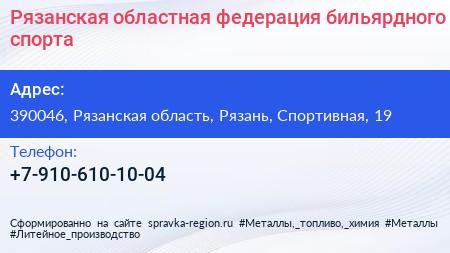 Рязанская областная федерация бильярдного спорта по адресу 390046, Рязанская область, Рязань, Спортивная, 19 в дальнейшем Организация, размещена в следующих категориях: