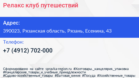 Релакс, клуб путешествий по адресу 390023, Рязанская область, Рязань, Есенина, 43 в дальнейшем Организация, размещена в следующих категориях: