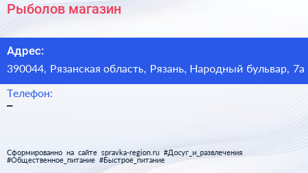 Рыболов, магазин по адресу 390044, Рязанская область, Рязань, Народный бульвар, 7а в дальнейшем Организация, размещена в следующих категориях: