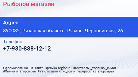 Рыболов, магазин по адресу 390035, Рязанская область, Рязань, Черновицкая, 26 в дальнейшем Организация, размещена в следующих категориях:
