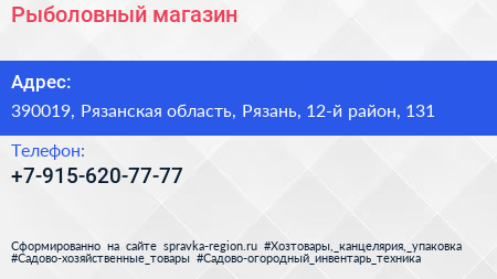 Рыболовный магазин по адресу 390019, Рязанская область, Рязань, 12-й район, 131 в дальнейшем Организация, размещена в следующих категориях: