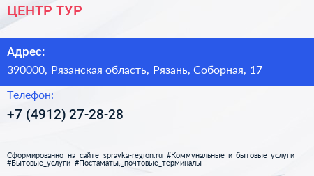 ЦЕНТР-ТУР по адресу 390000, Рязанская область, Рязань, Соборная, 17 в дальнейшем Организация, размещена в следующих категориях: