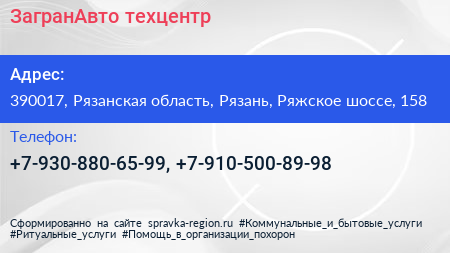ЗагранАвто, техцентр по адресу 390017, Рязанская область, Рязань, Ряжское шоссе, 158 в дальнейшем Организация, размещена в следующих категориях: