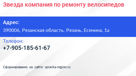 Звезда, компания по ремонту велосипедов по адресу 390006, Рязанская область, Рязань, Есенина, 1а в дальнейшем Организация, размещена в следующих категориях: