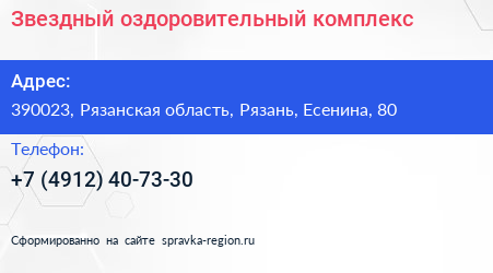 Звездный, оздоровительный комплекс по адресу 390023, Рязанская область, Рязань, Есенина, 80 в дальнейшем Организация, размещена в следующих категориях: