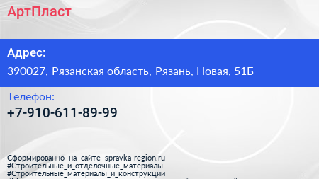 АртПласт по адресу 390027, Рязанская область, Рязань, Новая, 51Б в дальнейшем Организация, размещена в следующих категориях: