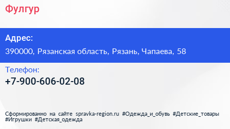 Фулгур по адресу 390000, Рязанская область, Рязань, Чапаева, 58 в дальнейшем Организация, размещена в следующих категориях:
