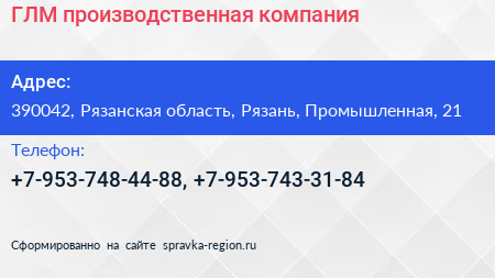 ГЛМ, производственная компания по адресу 390042, Рязанская область, Рязань, Промышленная, 21 в дальнейшем Организация, размещена в следующих категориях: