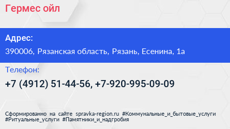 Гермес ойл по адресу 390006, Рязанская область, Рязань, Есенина, 1а в дальнейшем Организация, размещена в следующих категориях: