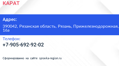 КАРАТ по адресу 390042, Рязанская область, Рязань, Прижелезнодорожная, 16а в дальнейшем Организация, размещена в следующих категориях: