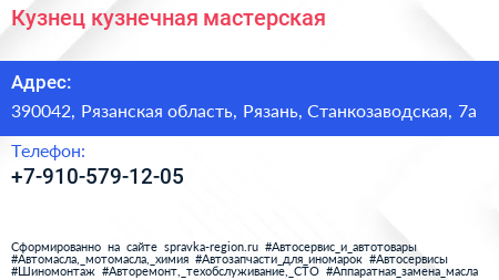 Кузнец, кузнечная мастерская по адресу 390042, Рязанская область, Рязань, Станкозаводская, 7а в дальнейшем Организация, размещена в следующих категориях: