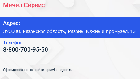 Мечел-Сервис по адресу 390000, Рязанская область, Рязань, Южный промузел, 13 в дальнейшем Организация, размещена в следующих категориях: