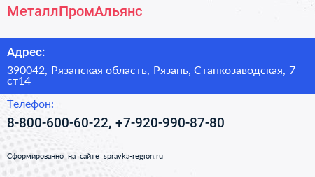 МеталлПромАльянс по адресу 390042, Рязанская область, Рязань, Станкозаводская, 7 ст14 в дальнейшем Организация, размещена в следующих категориях: