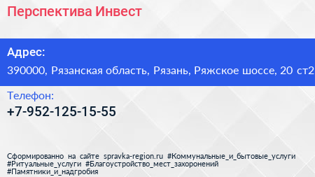 Перспектива Инвест по адресу 390000, Рязанская область, Рязань, Ряжское шоссе, 20 ст2 в дальнейшем Организация, размещена в следующих категориях: