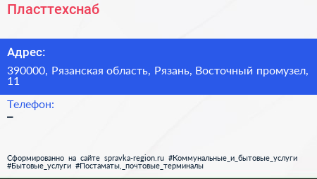Пласттехснаб по адресу 390000, Рязанская область, Рязань, Восточный промузел, 11 в дальнейшем Организация, размещена в следующих категориях: