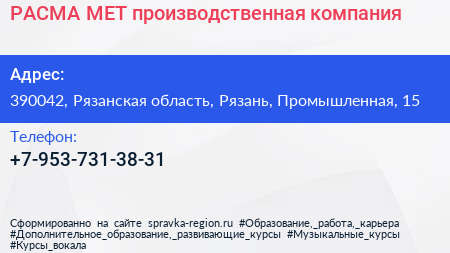 РАСМА-МЕТ, производственная компания по адресу 390042, Рязанская область, Рязань, Промышленная, 15 в дальнейшем Организация, размещена в следующих категориях: