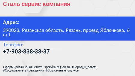 Сталь сервис, компания по адресу 390023, Рязанская область, Рязань, проезд Яблочкова, 6 ст1 в дальнейшем Организация, размещена в следующих категориях:
