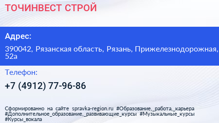 ТОЧИНВЕСТ-СТРОЙ по адресу 390042, Рязанская область, Рязань, Прижелезнодорожная, 52а в дальнейшем Организация, размещена в следующих категориях:
