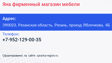 Яна, фирменный магазин мебели по адресу 390023, Рязанская область, Рязань, проезд Яблочкова, 4Б в дальнейшем Организация, размещена в следующих категориях: