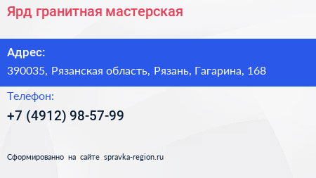 Ярд, гранитная мастерская по адресу 390035, Рязанская область, Рязань, Гагарина, 168 в дальнейшем Организация, размещена в следующих категориях: