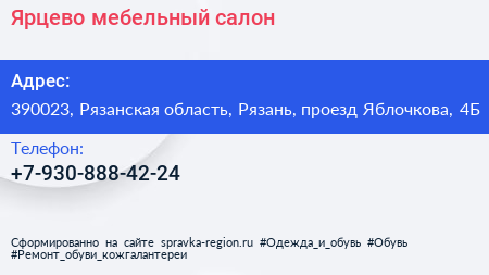 Ярцево, мебельный салон по адресу 390023, Рязанская область, Рязань, проезд Яблочкова, 4Б в дальнейшем Организация, размещена в следующих категориях: