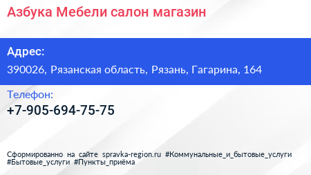 Азбука Мебели, салон-магазин по адресу 390026, Рязанская область, Рязань, Гагарина, 164 в дальнейшем Организация, размещена в следующих категориях: