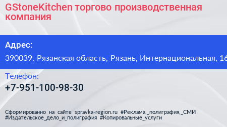 GStoneKitchen, торгово-производственная компания по адресу 390039, Рязанская область, Рязань, Интернациональная, 16 в дальнейшем Организация, размещена в следующих категориях: