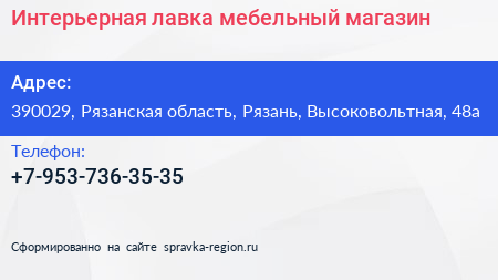 Интерьерная лавка, мебельный магазин по адресу 390029, Рязанская область, Рязань, Высоковольтная, 48а в дальнейшем Организация, размещена в следующих категориях: