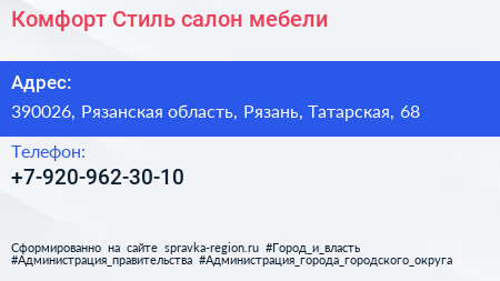 Комфорт-Стиль, салон мебели по адресу 390026, Рязанская область, Рязань, Татарская, 68 в дальнейшем Организация, размещена в следующих категориях: